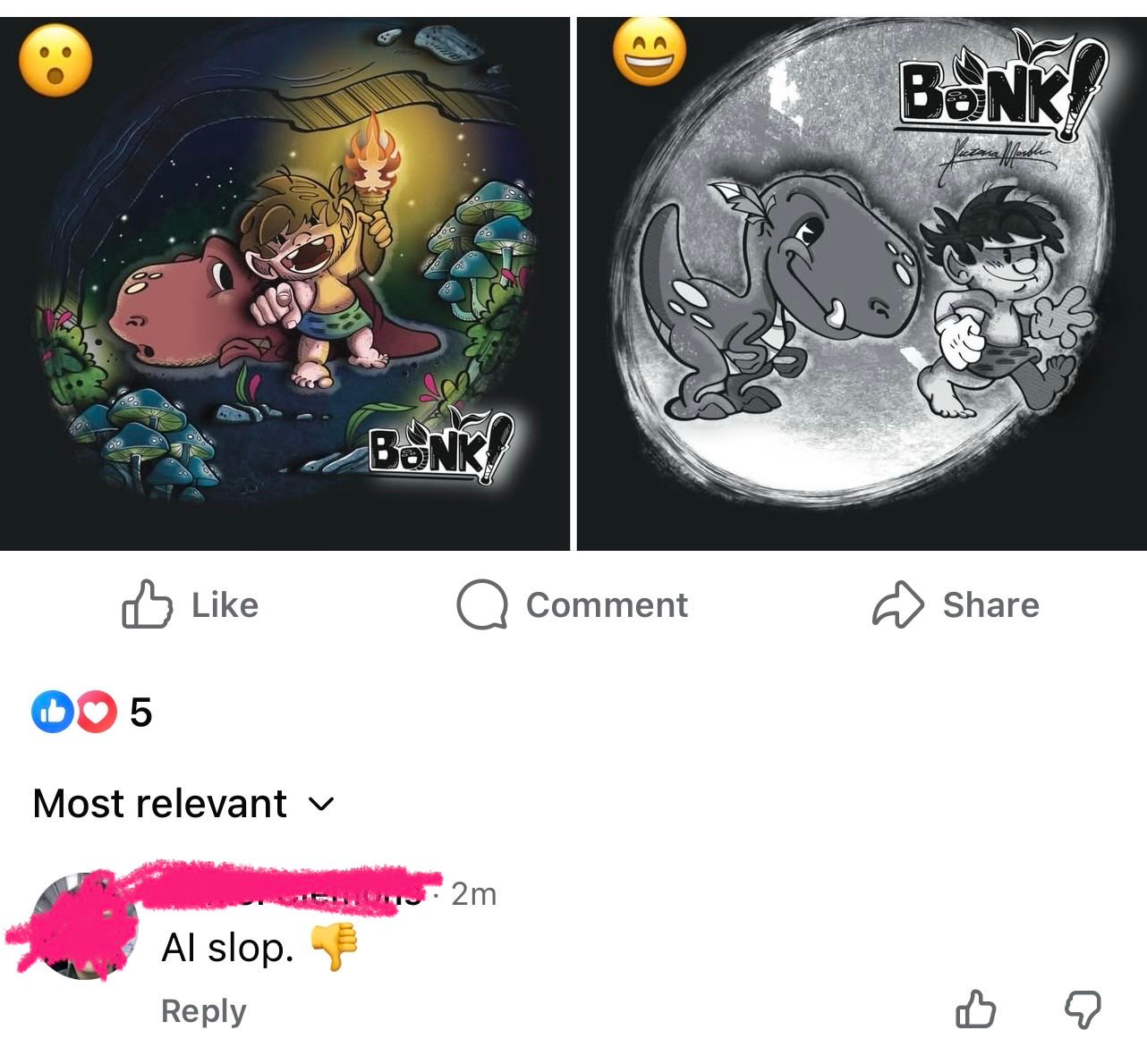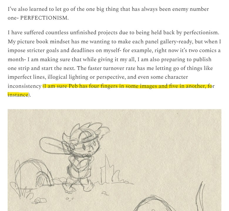 Their apparent reasoning for thinking this was because in one image, my character (Peb, from the BONK! comic), has four fingers, and in another, he clearly has five.